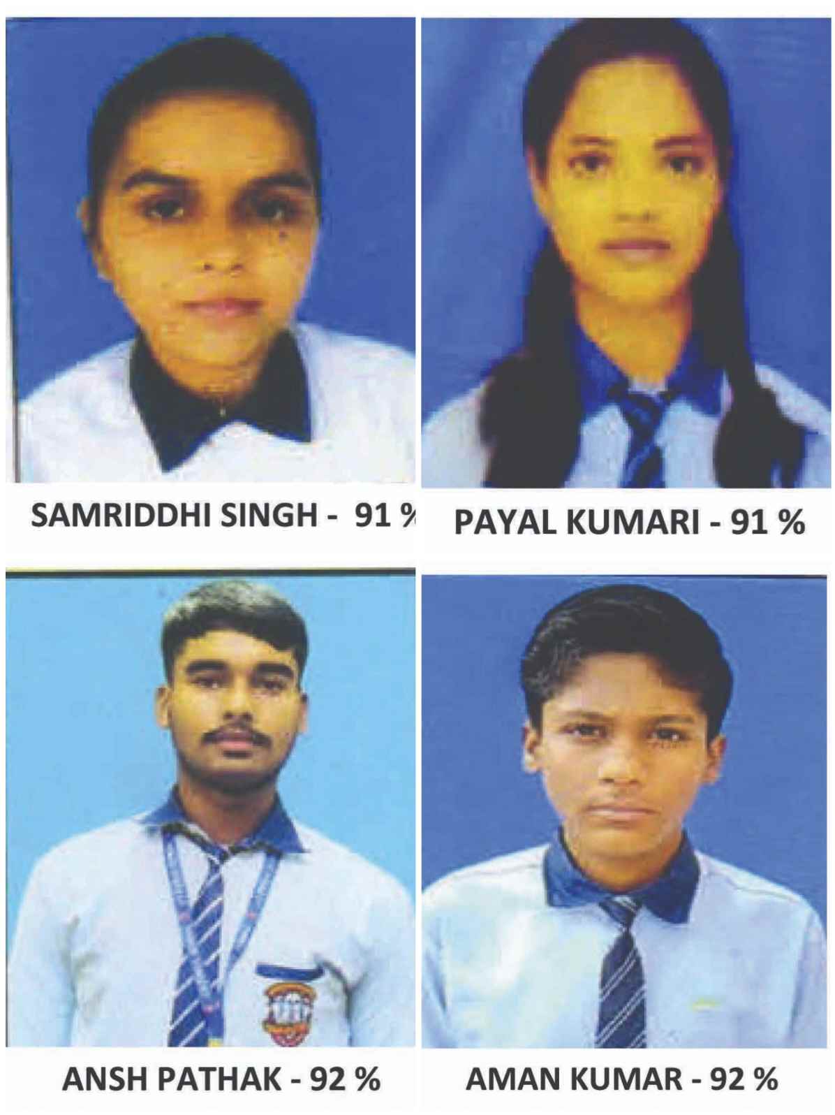 मेधावी छात्रों में अंश पाठक और अमन कुमार ने 92 प्रतिशत अंक प्राप्त कर संयुक्त रूप से सर्वोच्च स्थान हासिल किया। वहीं पायल कुमारी और समृद्धि सिंह ने 91 प्रतिशत अंक प्राप्त कर उत्कृष्ट प्रदर्शन किया।