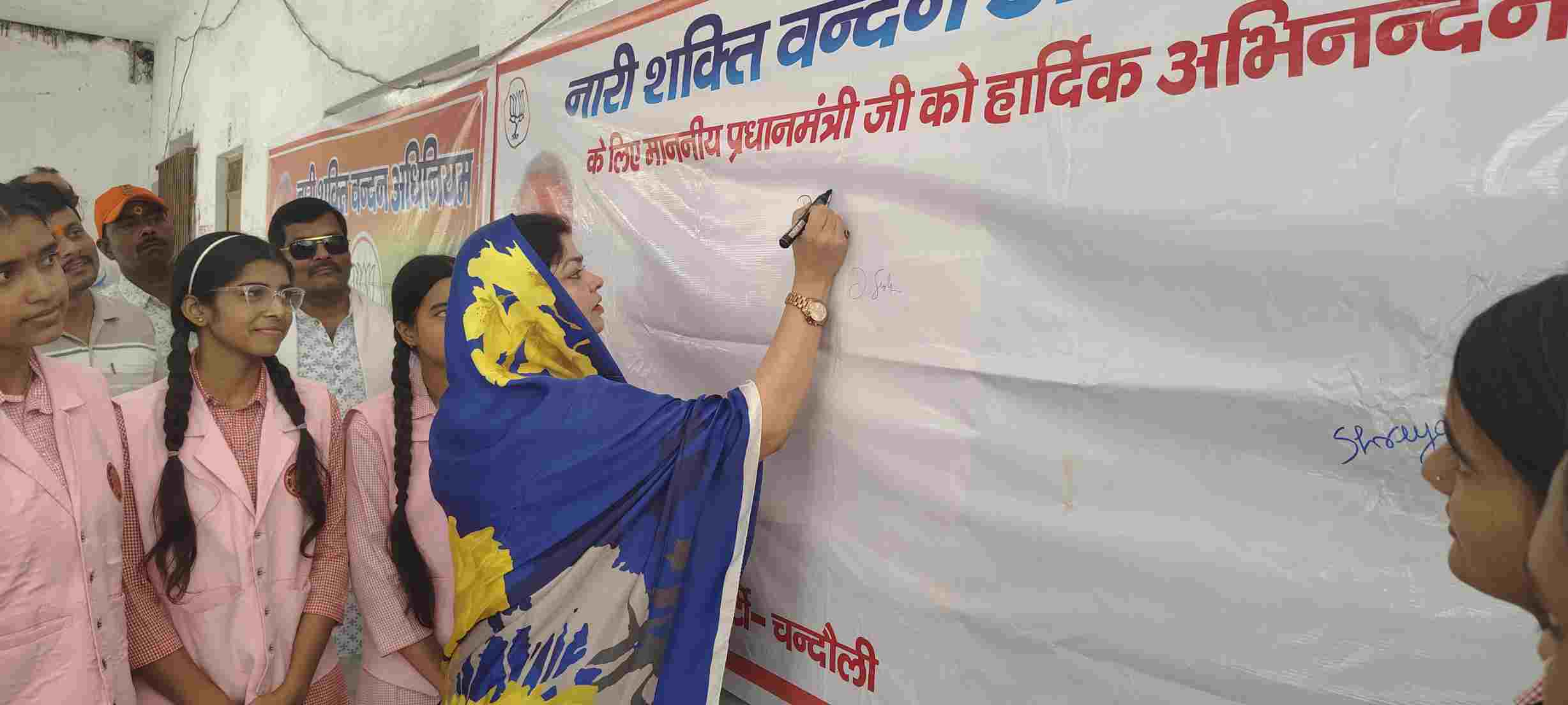 चंदौली । महेन्द्र टेक्निकल इंटर कालेज में बुधवार को नारी सशक्तिकरण को बढ़ावा देने के उद्देश्य से नारी शक्ति वंदन अधिनियम हस्ताक्षर अभियान कार्यक्रम का आयोजन किया गया। इसमें छात्राओं को अभियान के प्रति प्रेरित किया गया। मुख्य अतिथि राज्यसभा सदस्य दर्शना सिंह ने नारी शक्ति वंदन अधिनियम को महिला सशक्तिकरण की दिशा में ऐतिहासिक पहल बताया।