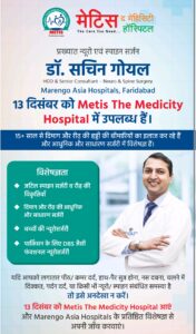 चंदौली। फरीदाबाद स्थित Marengo Asia Hospitals के HOD एवं सीनियर कंसल्टेंट न्यूरो एवं स्पाइन सर्जन डॉ. सचिन गोयल 13 दिसंबर को गोधना नगर के Metis The Medicity Hospital में मरीजों को परामर्श देंगे। 15 से अधिक वर्षों के अनुभव के साथ वे दिमाग और रीढ़ की बीमारियों की आधुनिक व साधारण सर्जरी, जटिल स्पाइन सर्जरी, बच्चों की न्यूरोसर्जरी एवं पार्किंसन के लिए DBS जैसी फंक्शनल न्यूरोसर्जरी में विशेषज्ञ हैं।