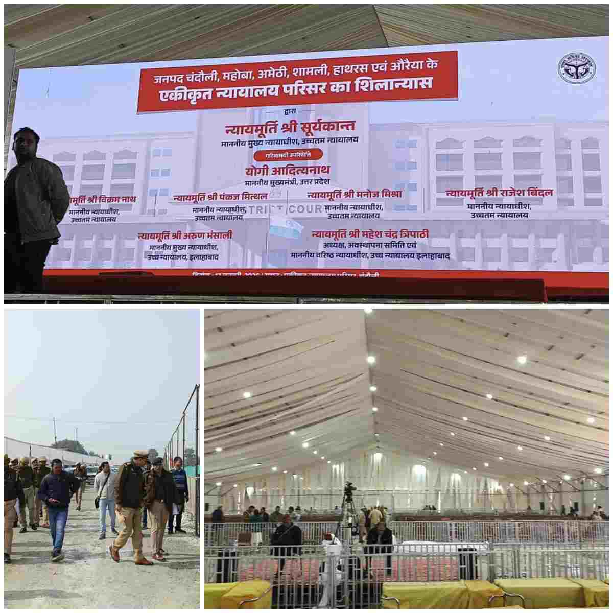 चंदौली। सुप्रीम कोर्ट के चीफ जस्टिस सूर्यकांत और मुख्यमंत्री योगी आदित्यनाथ शनिवार को चंदौली आएंगे। चीफ जस्टिस और सीएम जिले में बहुप्रतिक्षित न्यायालय भवन निर्माण की नींव रखेंगे। यहीं से प्रदेश के 6 जिलों के इंटीग्रेटेड कोर्ट काम्प्लेक्स का शिलान्यास करेंगे। कार्यक्रम को लेकर प्रशासनिक अमला तैयारियों में जुटा है। एडीजी पीयूष मोर्डिया, जिलाधिकारी चंद्रमोहन गर्ग और एसपी आदित्य लांग्हे ने कार्यक्रम स्थल का भ्रमण कर तैयारियां और सुरक्षा इंतजामों का जायजा लिया।
