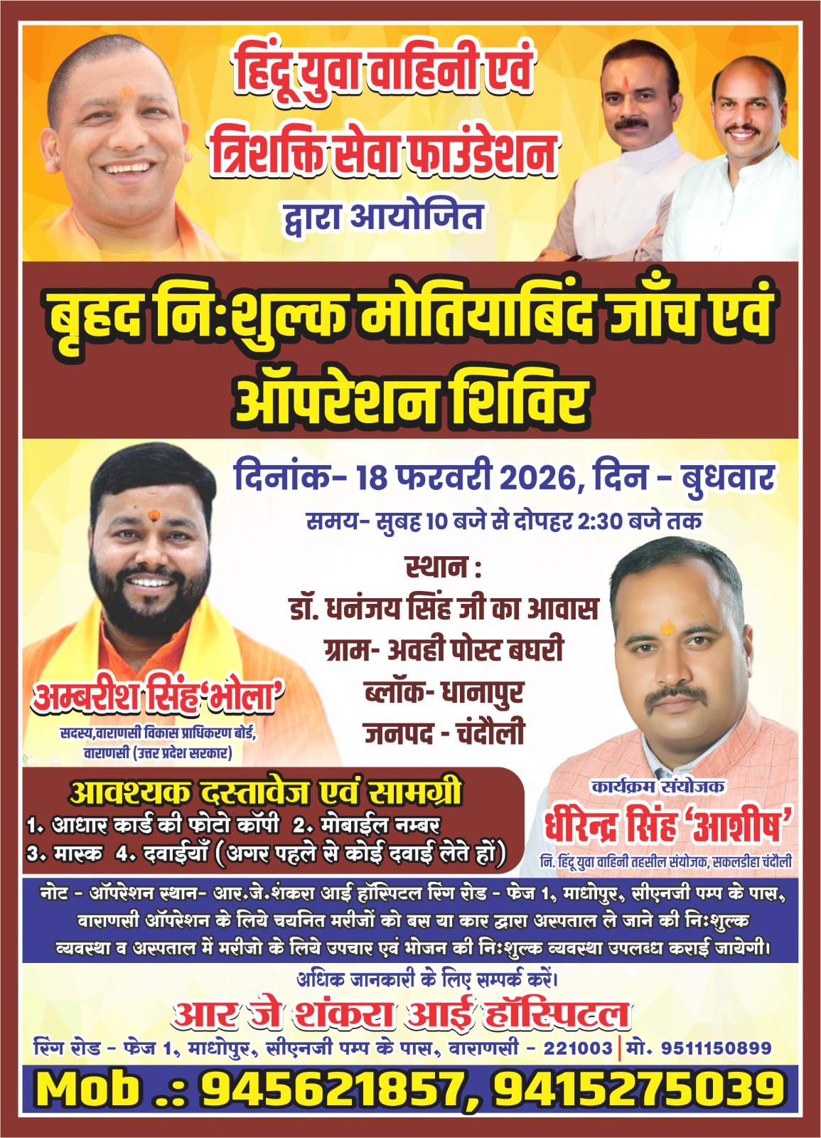 चंदौली। कमालपुर क्षेत्र के धानापुर विकासखंड अंतर्गत अवही गांव में 18 फरवरी को वृहद निःशुल्क नेत्र चिकित्सा शिविर का आयोजन किया जाएगा। इस शिविर में विशेष रूप से मोतियाबिंद की जांच और जरूरतमंद मरीजों के निःशुल्क ऑपरेशन की व्यवस्था की गई है। शिविर का आयोजन हिंदू युवा वाहिनी एवं त्रिशक्ति फाउंडेशन के संयुक्त तत्वावधान में किया जा रहा है।