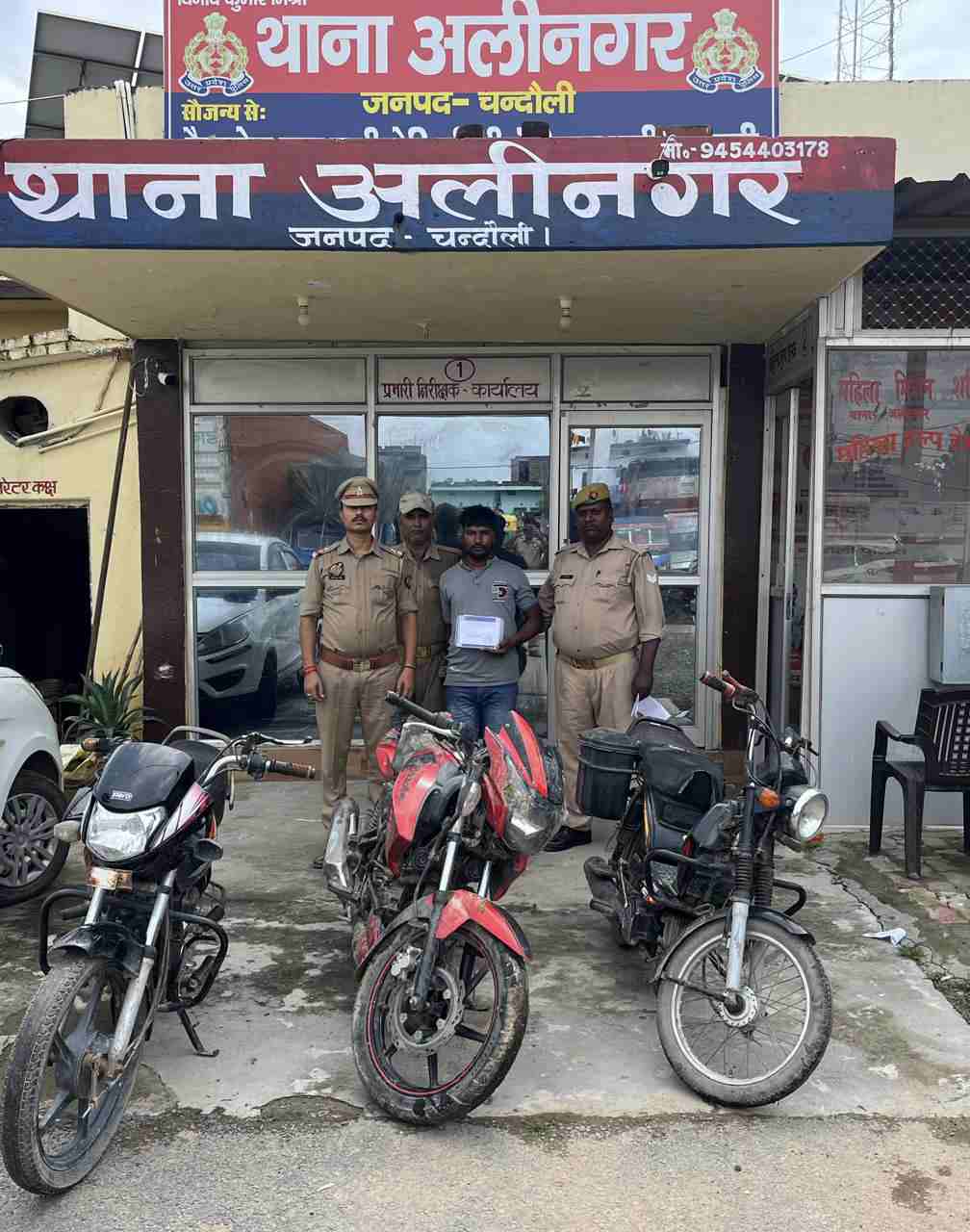 चंदौली। अपराधियों के खिलाफ चलाए जा रहे अभियान के तहत अलीनगर पुलिस ने 25 हजार रुपये के इनामी शातिर अपराधी शिव कुमार उर्फ शिवा उर्फ छल्ला यादव (निवासी कैथा उर्फ टड़िया, थाना अलीनगर) को गिरफ्तार कर लिया। उसके पास से एक देशी तमंचा 315 बोर, एक जिंदा कारतूस तथा तीन चोरी के दोपहिया वाहन (टीवीएस अपाचे, हीरो सीडी डीलक्स व टीवीएस लूना) बरामद की हुए।