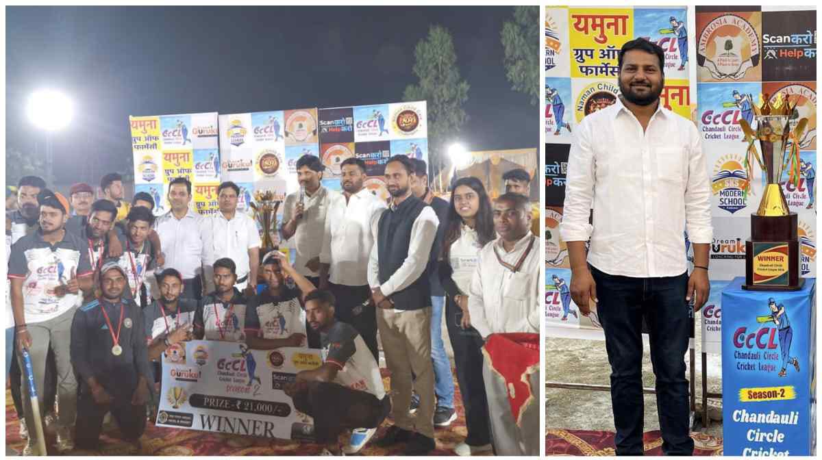 चंदौली। जिले के ताजपुर में आयोजित ‘चन्दौली सर्कल क्रिकेट लीग’ (CCCL) के दूसरे सीजन का भव्य समापन बेहद रोमांच और उत्साह के साथ हुआ। एम्ब्रोसिया एकेडमी के मैदान पर खेले गए फाइनल मुकाबले में ड्रीम गुरुकुल इंडियंस ने शानदार प्रदर्शन करते हुए स्कैनकरो स्मैशर को हराकर खिताब अपने नाम कर लिया।