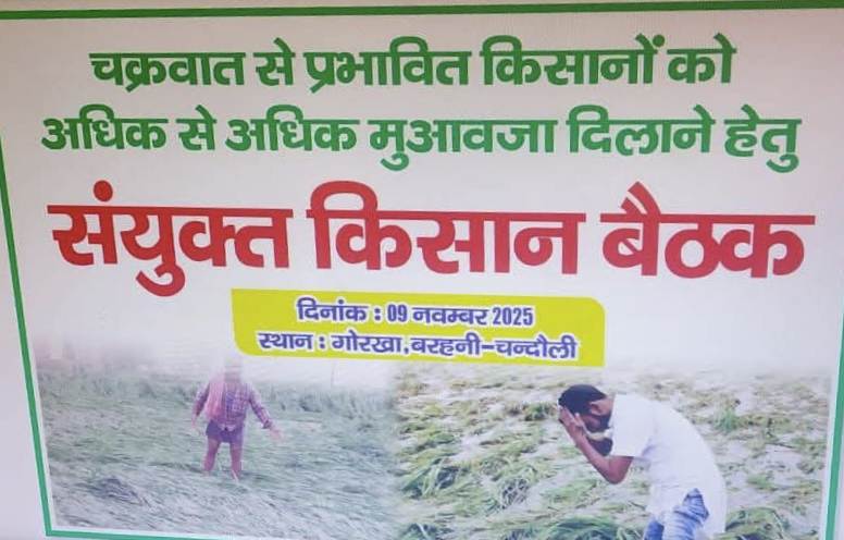 चंदौली। बेमौसम बरसात ने किसानों की कमर तोड़ दी है। फसलों को भारी नुकसान होने के बावजूद किसानों को अब तक शासन स्तर से कोई राहत नहीं मिल सकी है। इसी निराशा के बीच नरवन क्षेत्र के किसान आंदोलन की राह पकड़ सकते हैं। इसी कड़ी में किसान 9 नवंबर (रविवार) को बरहनी विकास खंड के गोरखा गांव स्थित मंदिर परिसर में महत्वपूर्ण बैठक करने जा रहे हैं, जिसमें आगे की रणनीति तय की जाएगी।