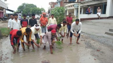 चंदौलीः ग्रामीणों ने पानी से लबालब सड़क पर धान रोप जनप्रतिनिधियों को दिखाया आईना