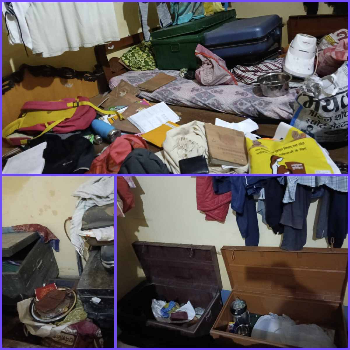 अरुण कुमार यादव अपने परिवार के साथ मकान के ग्राउंड फ्लोर पर सो रहे थे। रात करीब दो बजे खट-खट की आवाज सुनाई देने पर जब परिवार के लोग दूसरे फ्लोर पर पहुंचे तो कमरों की हालत देख सन्न रह गए। घर के बक्से टूटे पड़े थे, जिसके बाद शोर-शराबा शुरू हो गया।
