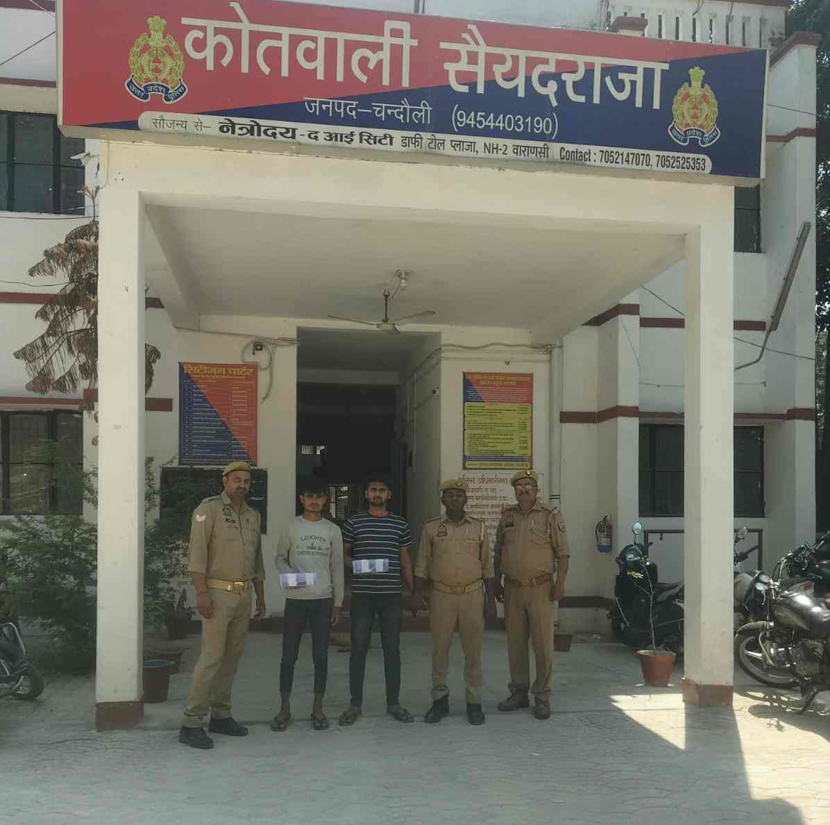 चंदौली। सैयदराजा पुलिस ने चेकिंग अभियान के दौरान दो अभियुक्तों को गिरफ्तार किया, जिनके कब्जे से 2 अवैध असलहे (315 बोर) और 2 जिंदा कारतूस बरामद किए गए। थाना प्रभारी अशोक कुमार मिश्रा के नेतृत्व में पुलिस टीम ने ग्राम फेसुड़ा के पास संदिग्ध व्यक्तियों की चेकिंग के दौरान मुखबिर की सूचना पर दोनों को गिरफ्तार किया।